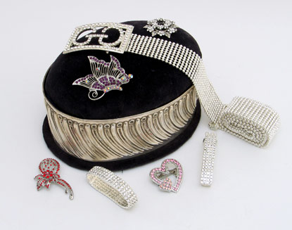 A selection of contemporary costume jewellery including brooches, belts, buckles, bangles, earrings and necklaces. Many more available in store. Prices from £9.